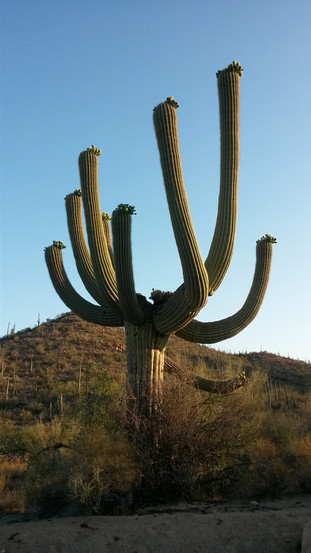 Even a Virginia hillbilly like me knew to expect these living cathedrals when I moved here almost 25 years ago since Saguaro are western-movie-star famous for their many, heaven-reaching arms. The ancient ones can easily grow over 50 arms and weigh almost 5000 water-laden pounds! These arms’ sole (nay - soul!) purpose is to provide extra cactus real estate for the production of more flowers, which bloom only at the arm tips, and thus more potential baby Saguaro in the form of seeds. (We half joke that after you eat Saguaro fruit you have a duty to the desert to do your dootie outside under a frost-protective, nurse tree.) These patient giants live up to 200 years but don’t get their first reproductive arm until they reach middle age like me. (Paul's time lapse video here shows how much they're appreciated.)